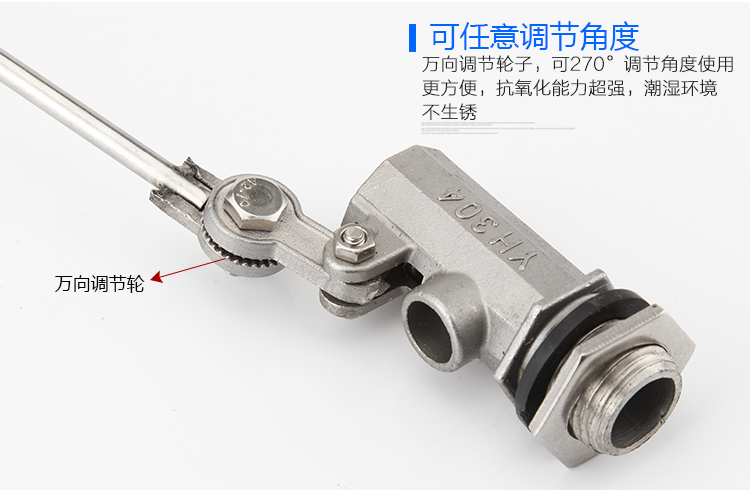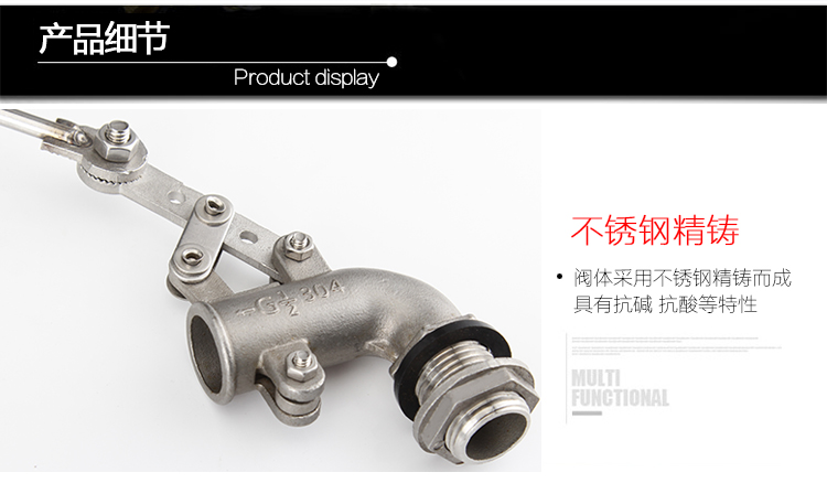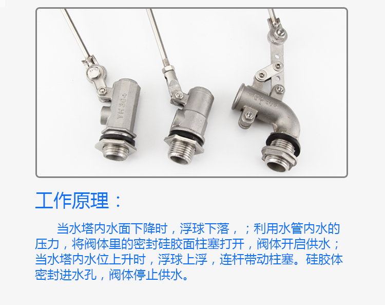 當(dāng)水塔內(nèi)水面下降時,浮球下落,;利用水管內(nèi)水的壓力,將閥體里的密封硅膠面柱塞打開,閥體開啟供水;當(dāng)水塔內(nèi)水位上升時,浮球上浮,連桿帶動柱塞。硅膠體密封進水孔,閥體停止供水。