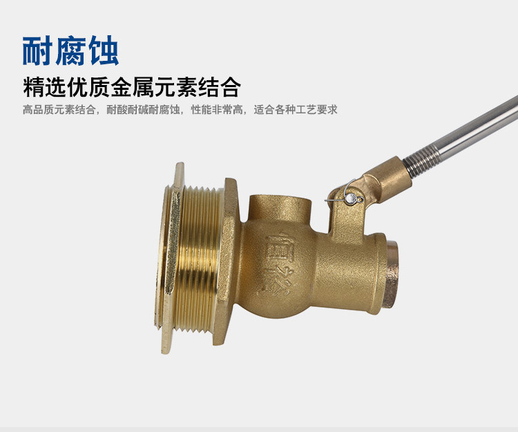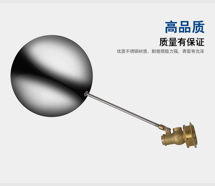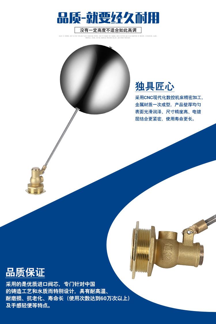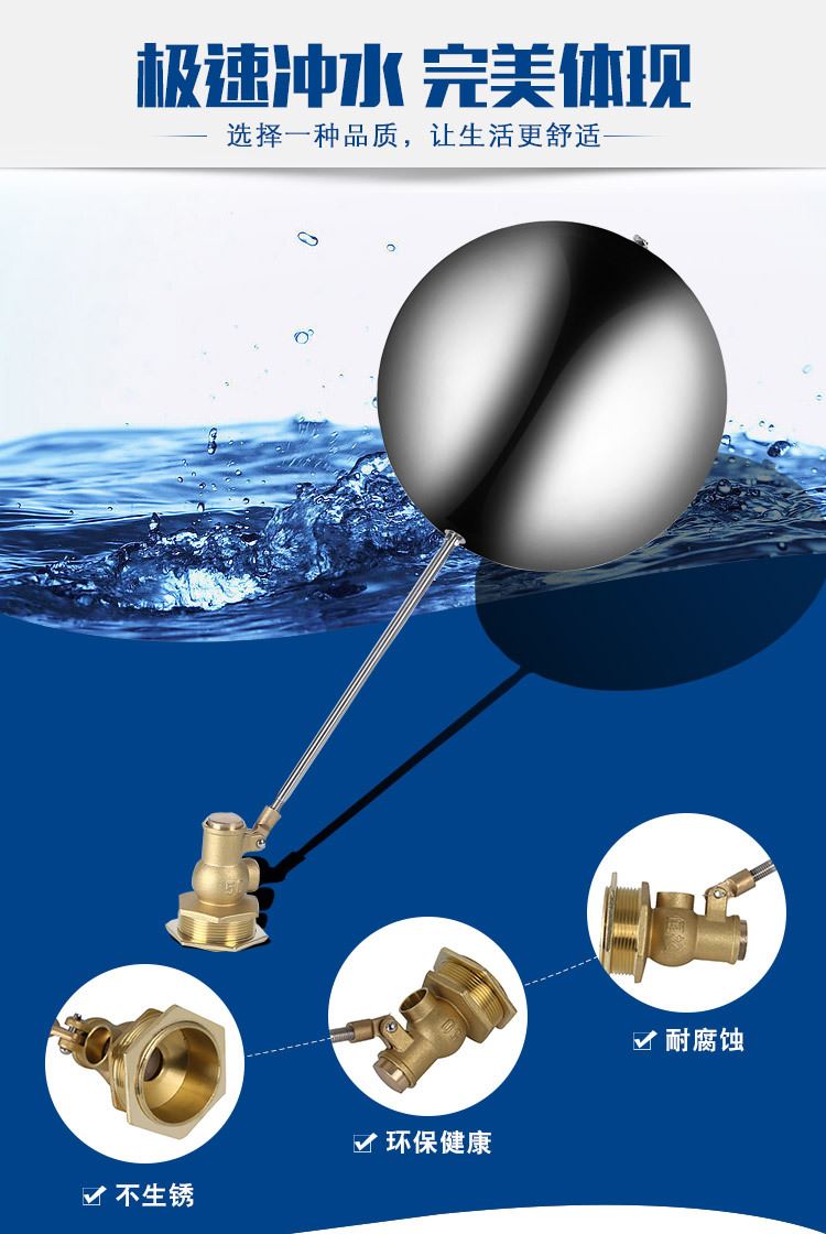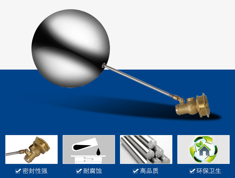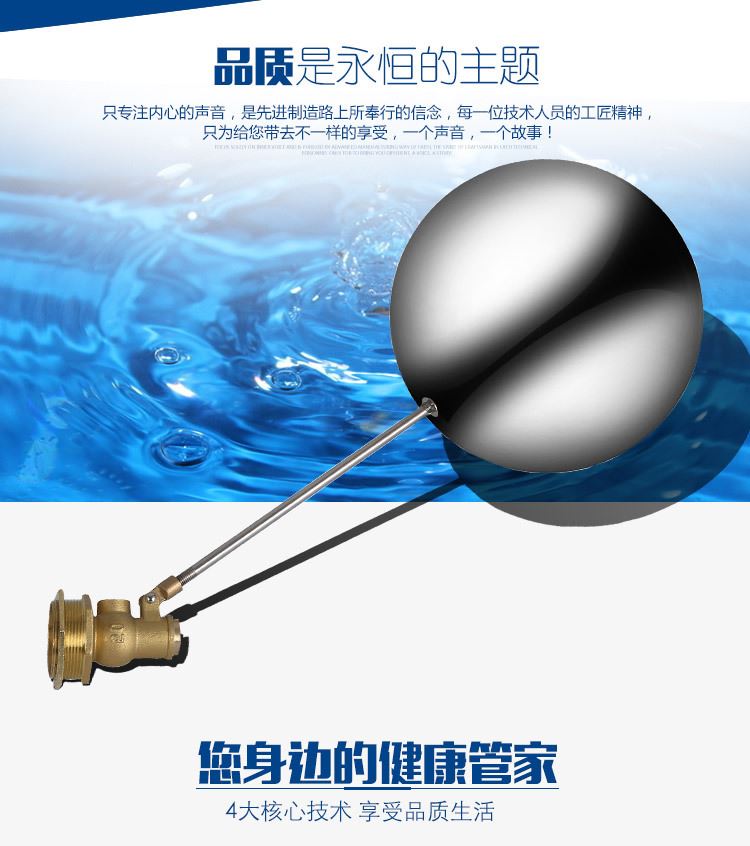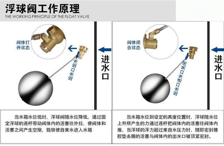 當(dāng)水塔內(nèi)水面下降時(shí),浮球下落,利用水管內(nèi)水的壓力,將閥體里的密封硅膠柱塞打開(kāi),閥體開(kāi)啟供水,當(dāng)水塔水位上升時(shí),浮球上浮,連桿帶動(dòng)柱塞,硅膠體密封進(jìn)水孔,閥體停止供水.